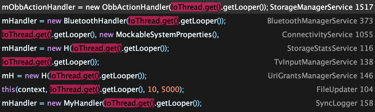 ServiceThread 继承自 HandlerThread ,下面介绍的几个工作线程都是继承自 ServiceThread ,分别实现不同的功能,根据线程功能不同,其线程优先级也不同:UIThread、IoThread、DisplayThread、AnimationThread、FgThread、SurfaceAnimationThread