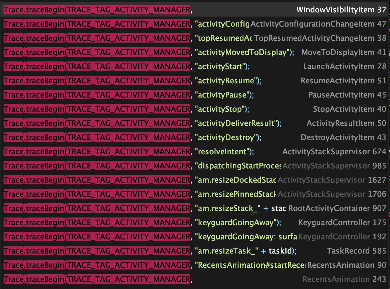 AMS 和 WMS 算是 SystemServer 中最繁忙的两个 Service 了,与 AMS 相关的 Trace 一般会用 TRACE_TAG_ACTIVITY_MANAGER 这个 TAG,在 Systrace 中的名字是 ActivityManager
