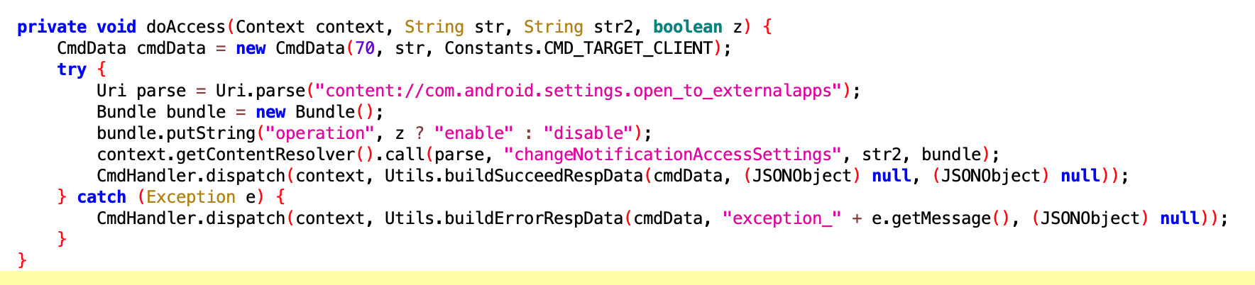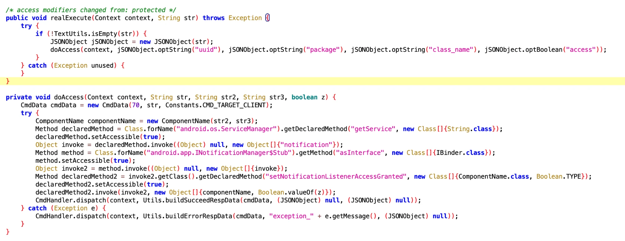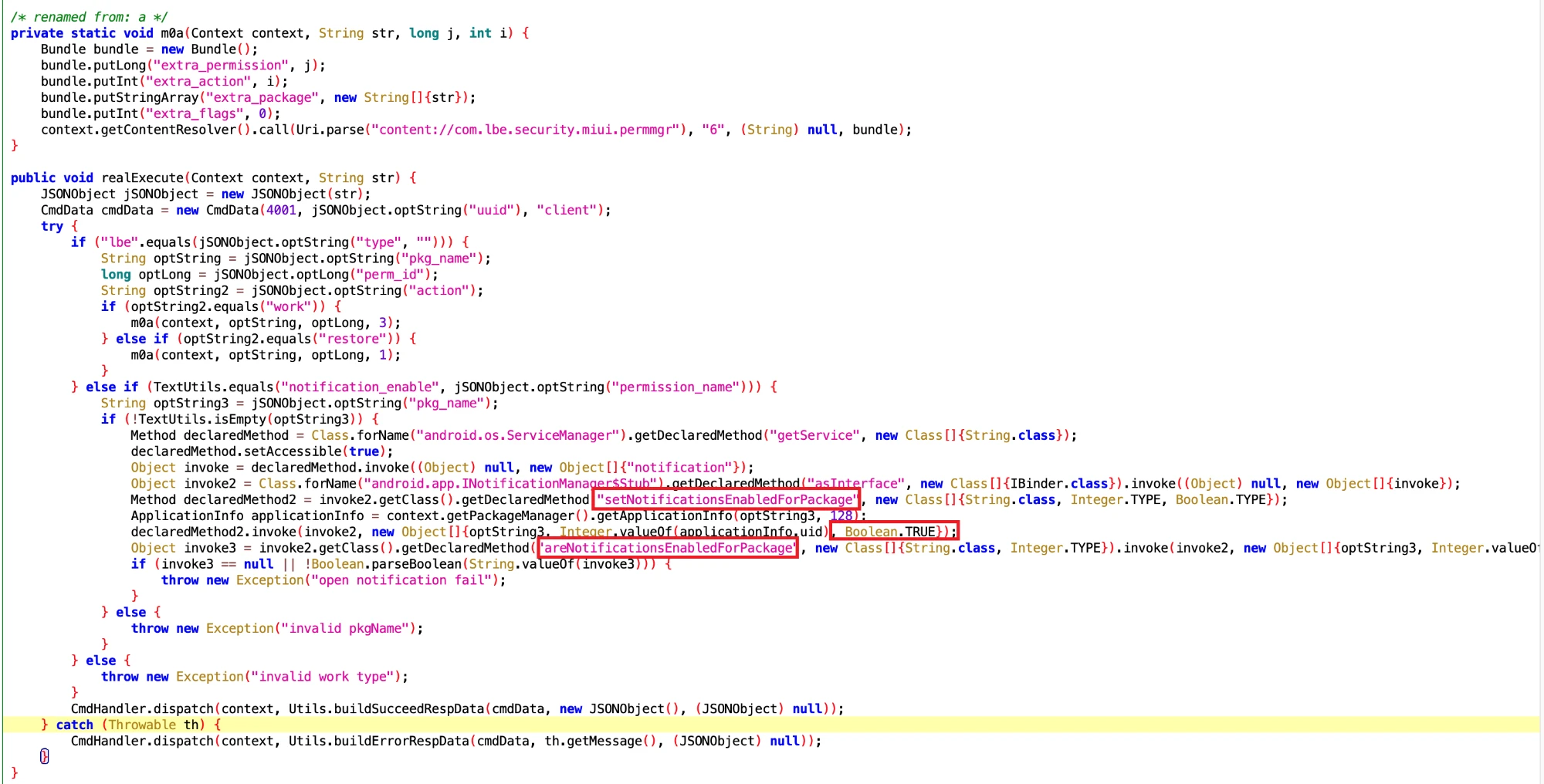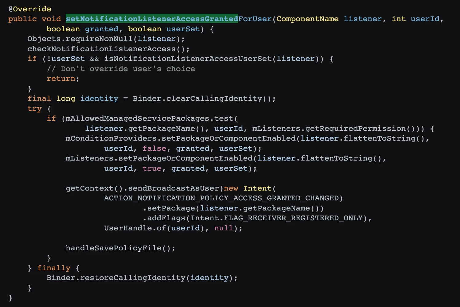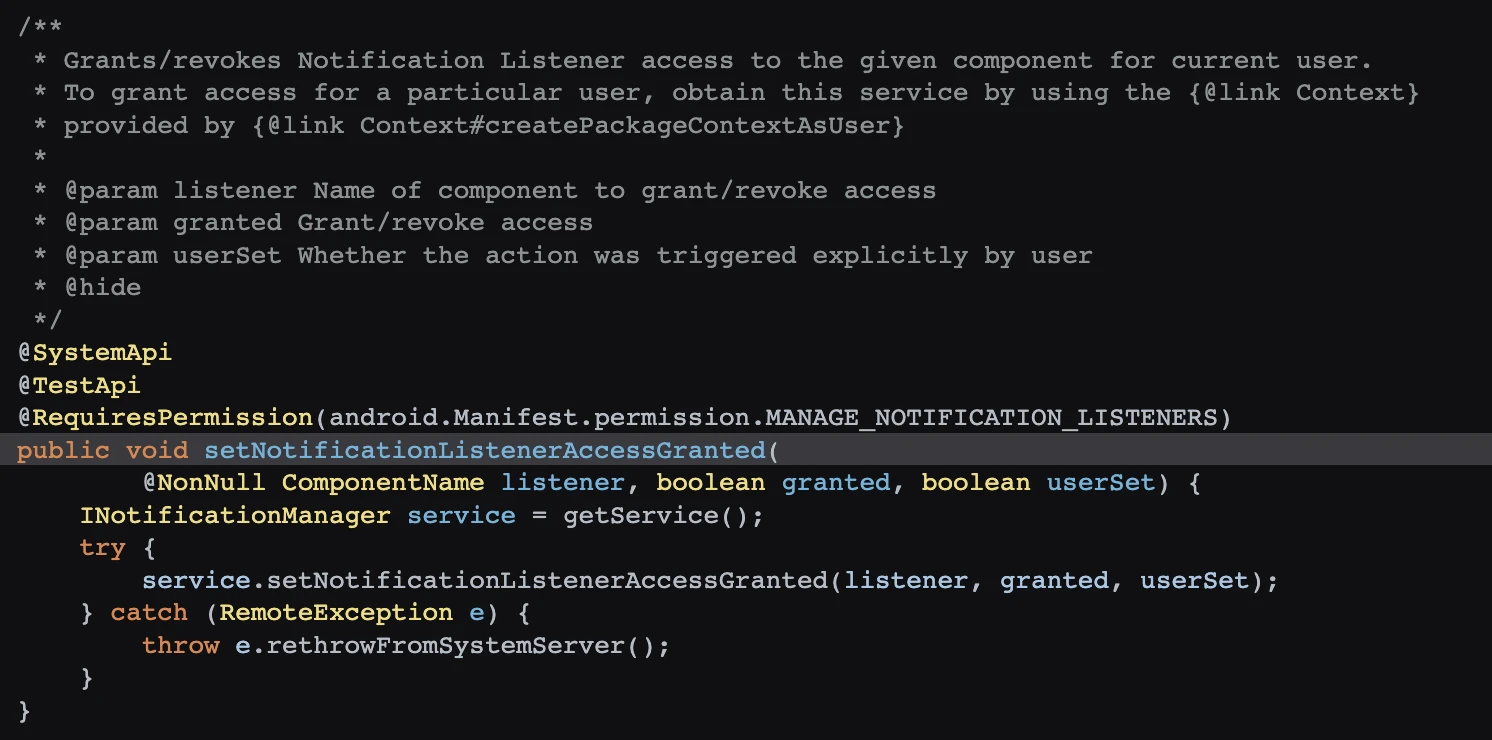 这个反射调用的 setNotificationListenerAccessGranted 是个 SystemAPI,获得通知的使用权,果然有权限就可以为所欲为