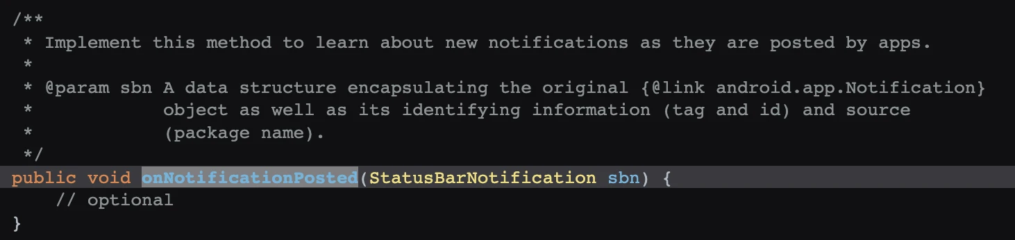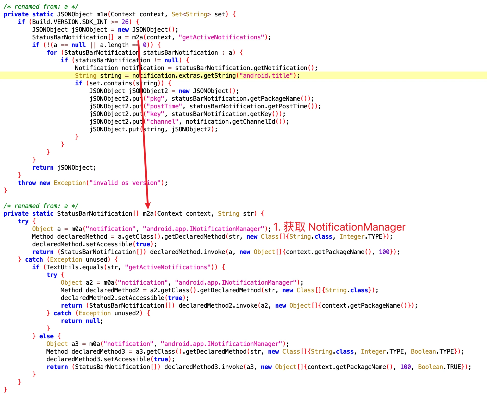 通过 getService 传入 NotificationManagerService 获取 NotificationManager 之后,就可以调用 getActiveNotifications 这个方法了,然后具体拿到 Notification 的下面几个字段