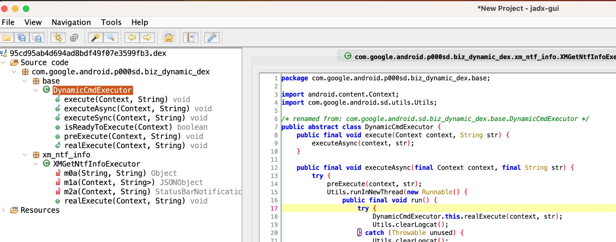 默认是用 jadx 打开,就可以看到反编译之后的内容,我们重点看 Executor 里面的代码逻辑即可