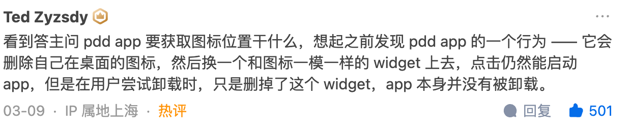 最好我还加上了这篇文章在微信公众号发出去之后的用户评论,以及知乎回答的评论区(问题已经被删了,但是我可以看到:如何评价拼多多疑似利用漏洞攻击用户手机,窃取竞争对手软件数据,防止自己被卸载? - Gracker的回答 - 知乎 https://www.zhihu.com/question/587624599/answer/2927765317,目前为止是 2471 个赞)可以说是脑洞大开(关于 App 如何作恶)。