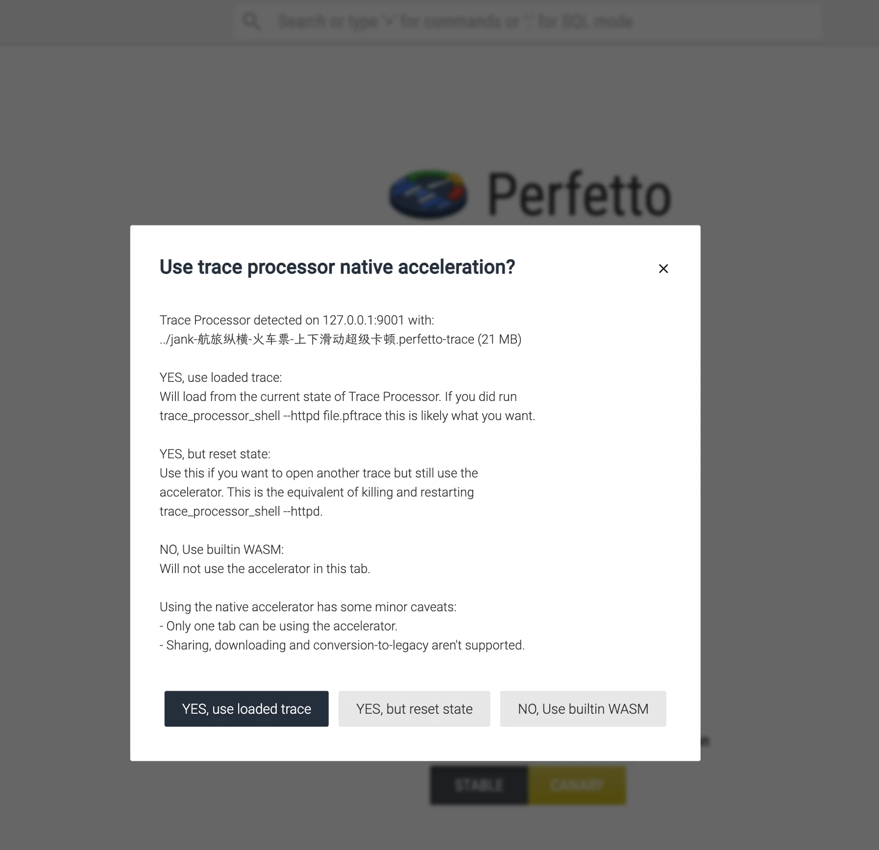 若你已通过trace_processor_shell --httpd加载了 trace 文件,且希望 UI 直接使用当前进程的解析状态(包括已执行的 SQL 查询、过滤条件等),选择此选项。 - 优势: