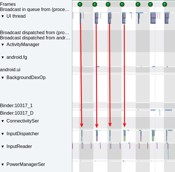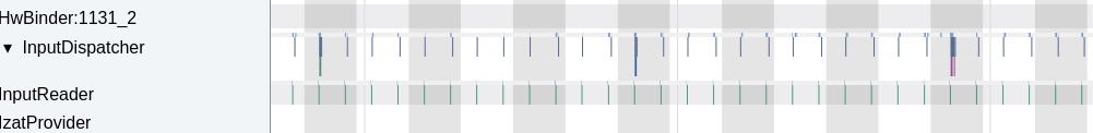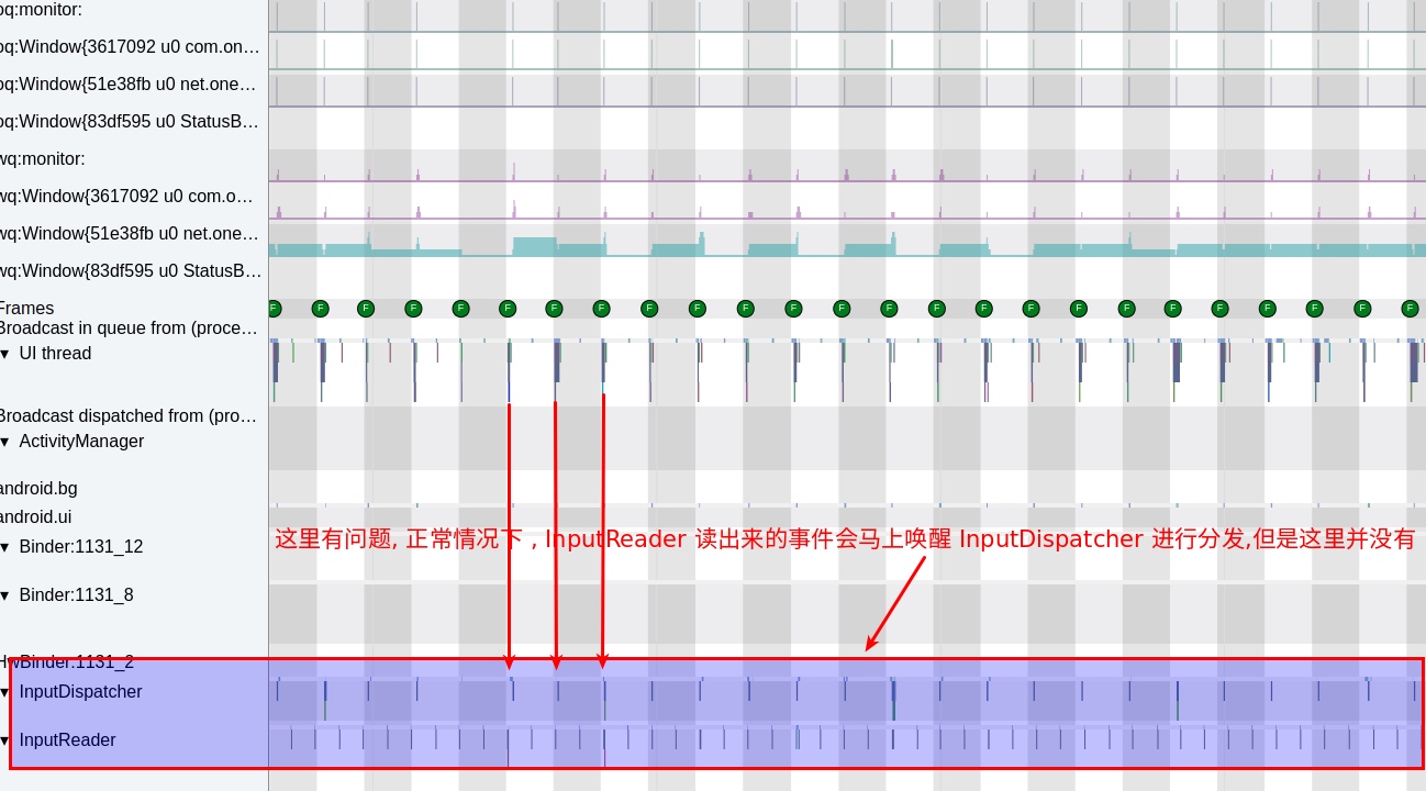 From the figure, it can be seen that the InputReader thread is working properly, but the InputDispatcher thread has problems. You can see the correspondence between these two threads under normal circumstances: