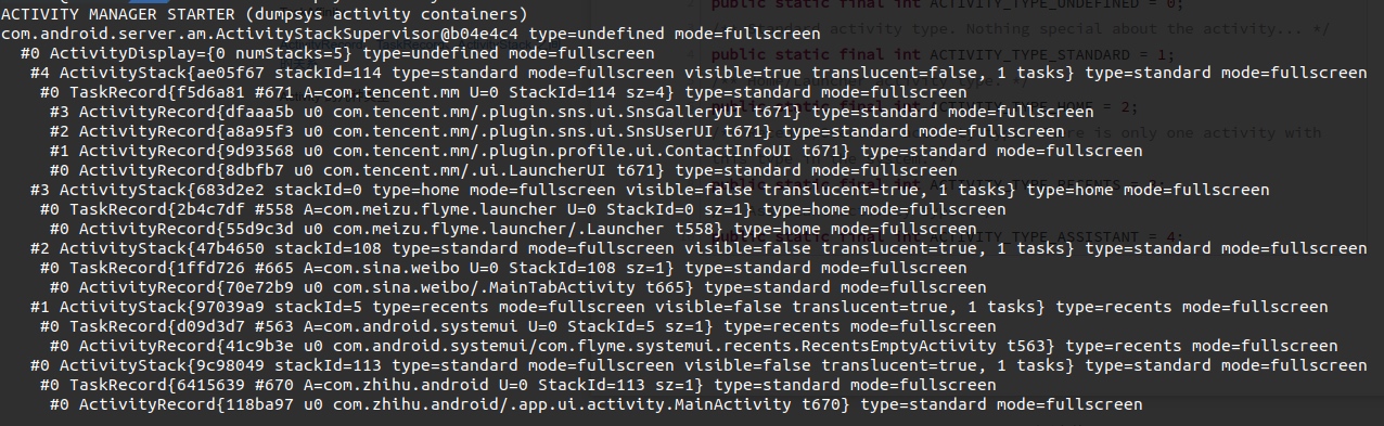 Below is an example dump showing the current phone’s ActivityRecord, TaskRecord, and ActivityStack: (adb shell dumpsys activity containers)