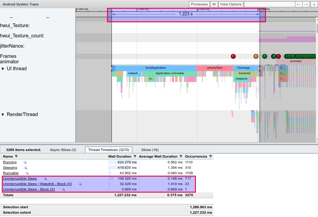 When I/O is heavy, app operations involving disk access (loading views, reading files, configs, or odex files) trigger Uninterruptible Sleep, significantly slowing down the app.