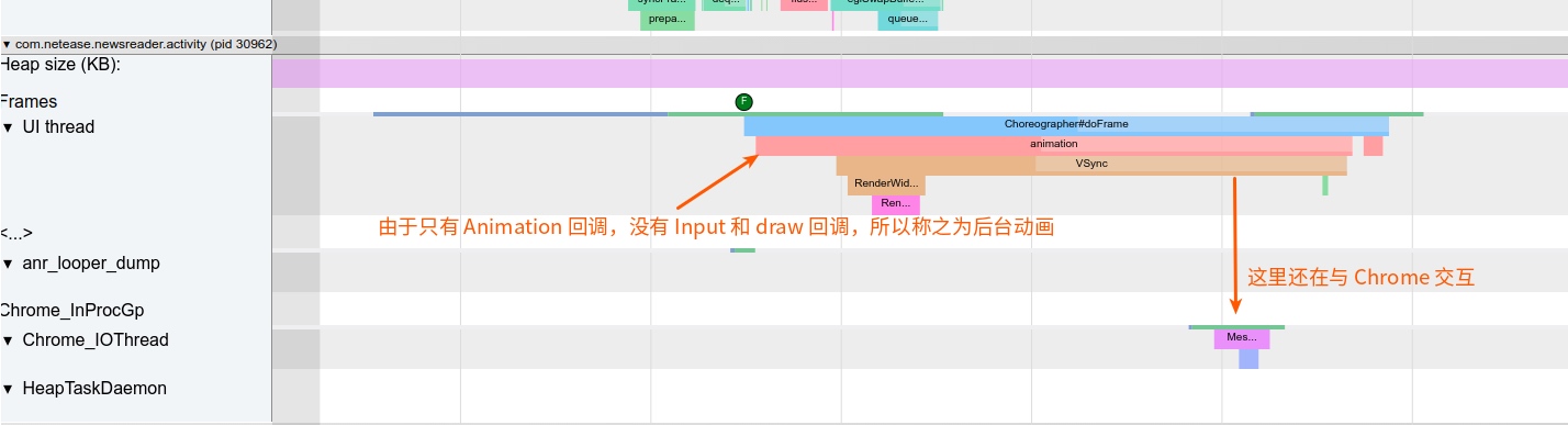 After using NetEase News and returning to the home screen, we captured a Systrace while swiping. Even in the background, the app is consistently firing doFrame operations (see the red box below).