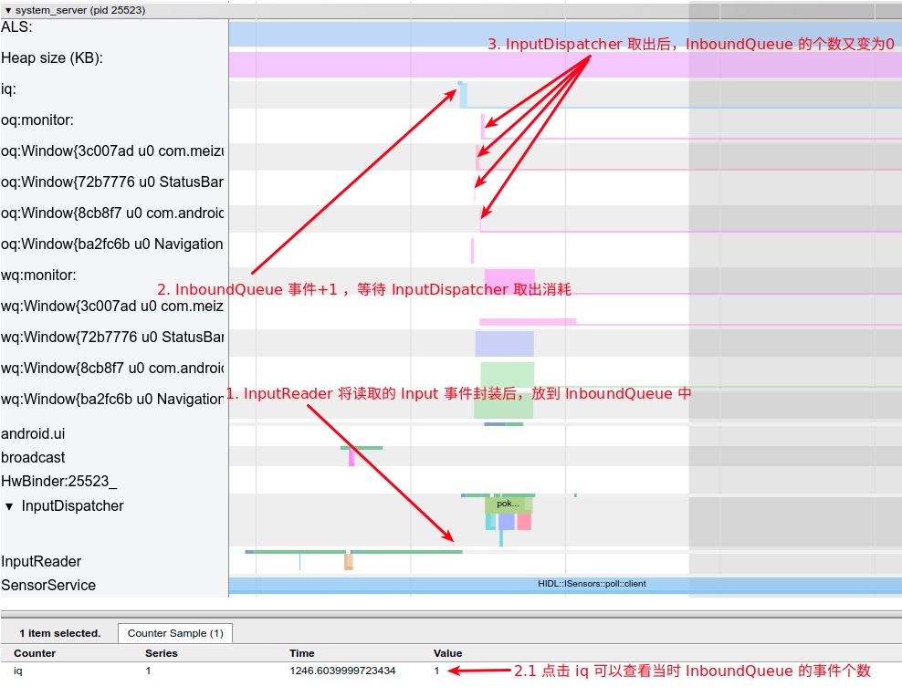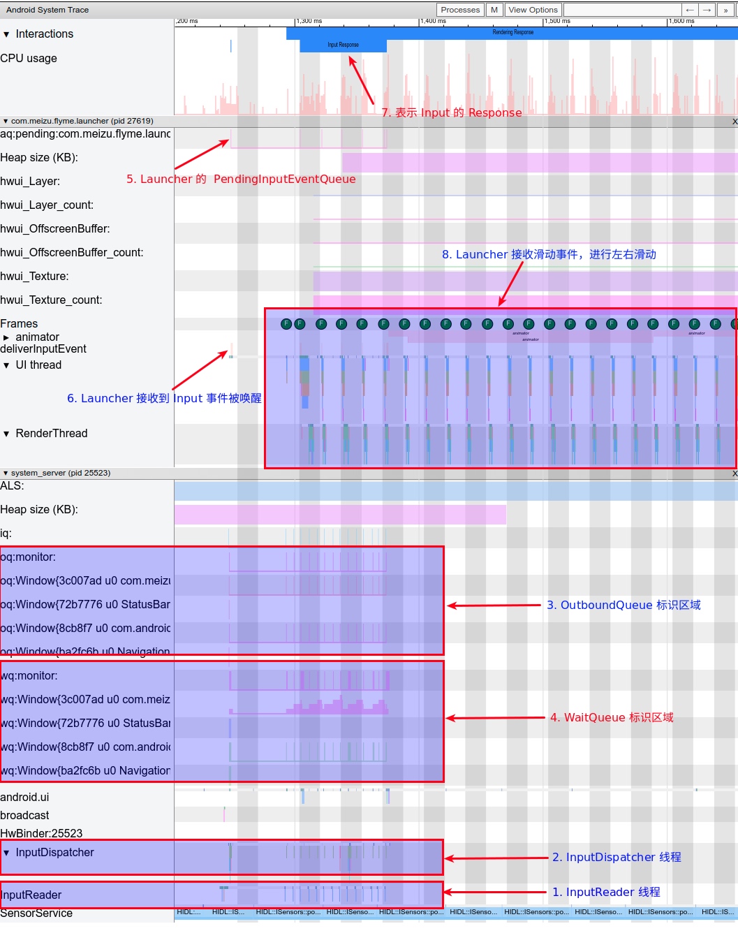 InputReader and InputDispatcher are two Native threads running within SystemServer, responsible for reading and dispatching Input events. Our Systrace analysis begins here. Below is a brief explanation of the marked numbers in the diagram: