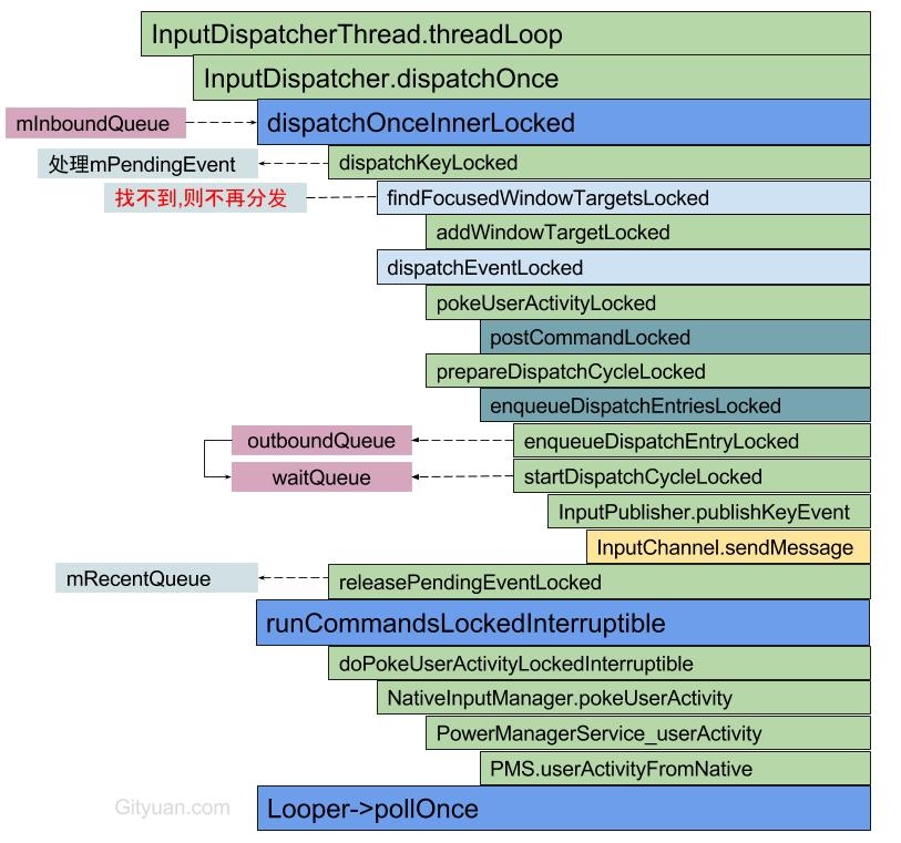 dispatchOnceInnerLocked(): TakesEventEntryfrommInboundQueue. The start time of this method (currentTime) becomes thedeliveryTimefor subsequentdispatchEntry.dispatchKeyLocked(): May adddoInterceptKeyBeforeDispatchingLockedInterruptibleunder certain conditions.enqueueDispatchEntryLocked(): GeneratesDispatchEntryand adds it to the connection’soutboundqueue.startDispatchCycleLocked(): TakesDispatchEntryfromoutboundQueueand moves it to the connection’swaitQueue.InputChannel.sendMessage: Sends the message to the remote process via socket.runCommandsLockedInterruptible(): Iteratively processes all commands inmCommandQueue(added viapostCommandLocked()).