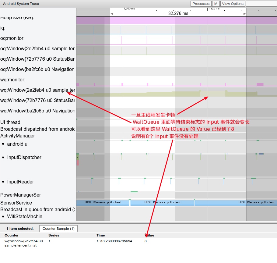 If the main thread is janky, Input events aren’t consumed in time, which manifests in the WaitQueue: