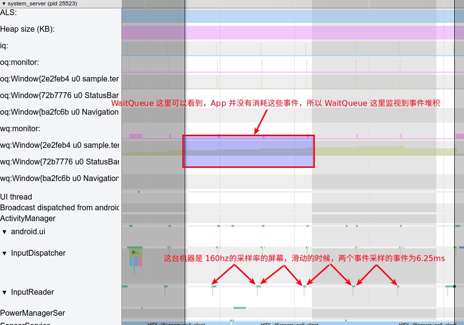 In the diagram, InputReader reads data every 6.25ms and hands it to InputDispatcher for dispatching. Is a higher sampling rate always better? Not necessarily. As shown, even if data is read every 6.25ms, the WaitQueue shows the App isn’t consuming it. Why?