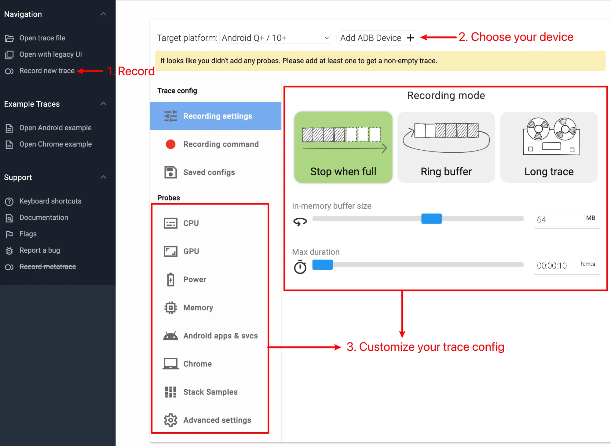 Perfetto also provides a powerful Web Tool (ui.perfetto.dev), allowing developers to configure and start tracking through the browser. You just need to visit the website, click “Record new trace”, and then select data sources and configuration parameters as needed. Make sure your device is connected to the computer via ADB, and select “Add ADB device” on the web page. After that, click “Start Recording” to start collecting tracking data.