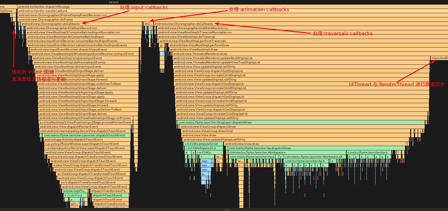 FrameDisplayEventReceiver.onVsync, entering Choreographer’s main processing functiondoFrame Choreographer.doFramecalculates frame drop logicChoreographer.doFrameprocesses Choreographer’s first callback: inputChoreographer.doFrameprocesses Choreographer’s second callback: animationChoreographer.doFrameprocesses Choreographer’s third callback: insets animationChoreographer.doFrameprocesses Choreographer’s fourth callback: traversal- UIThread and RenderThread synchronize data in traversal-draw