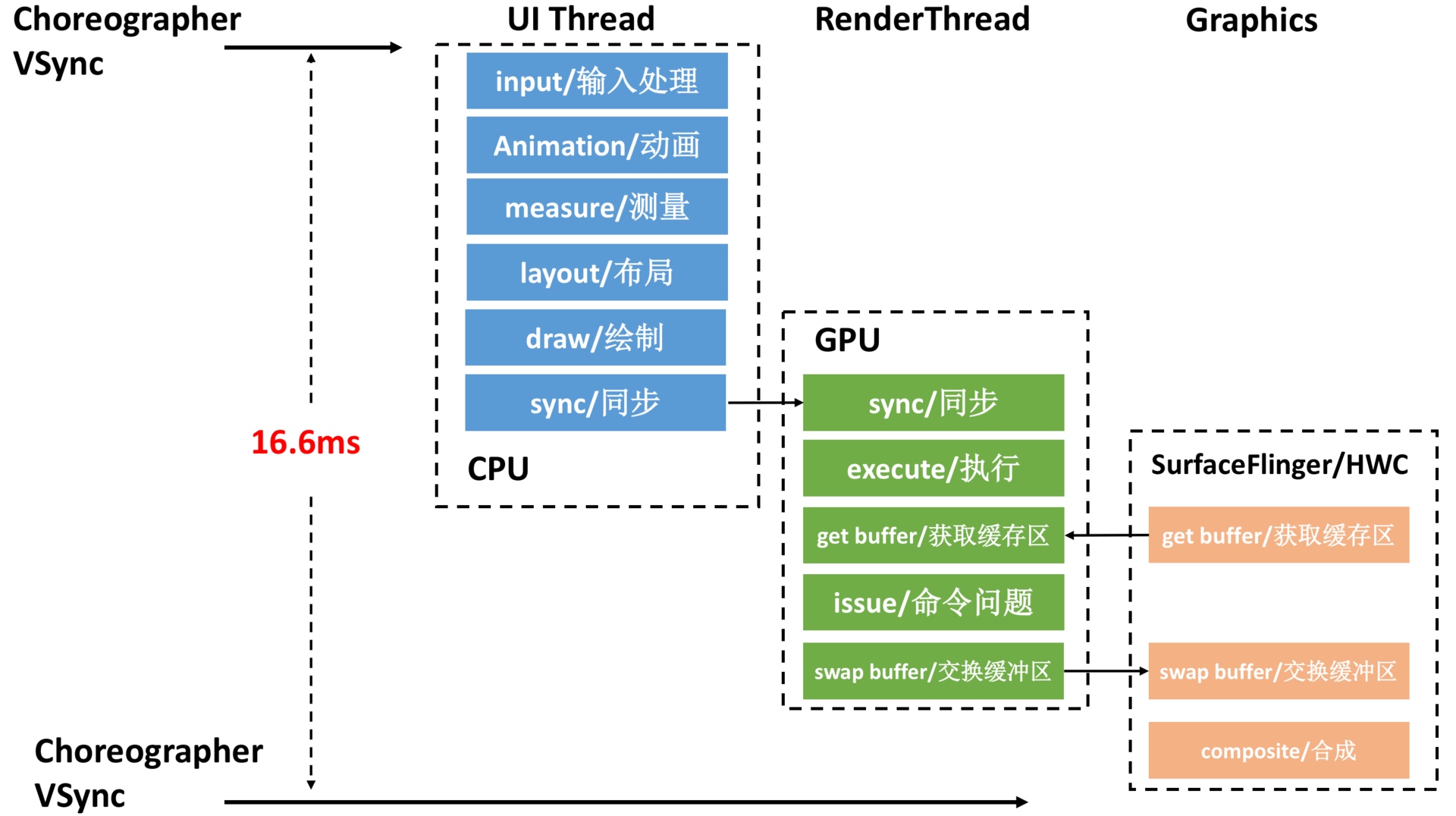 - Processing flow of each frame: Receive Vsync signal callback -> UI Thread –> RenderThread –> SurfaceFlinger